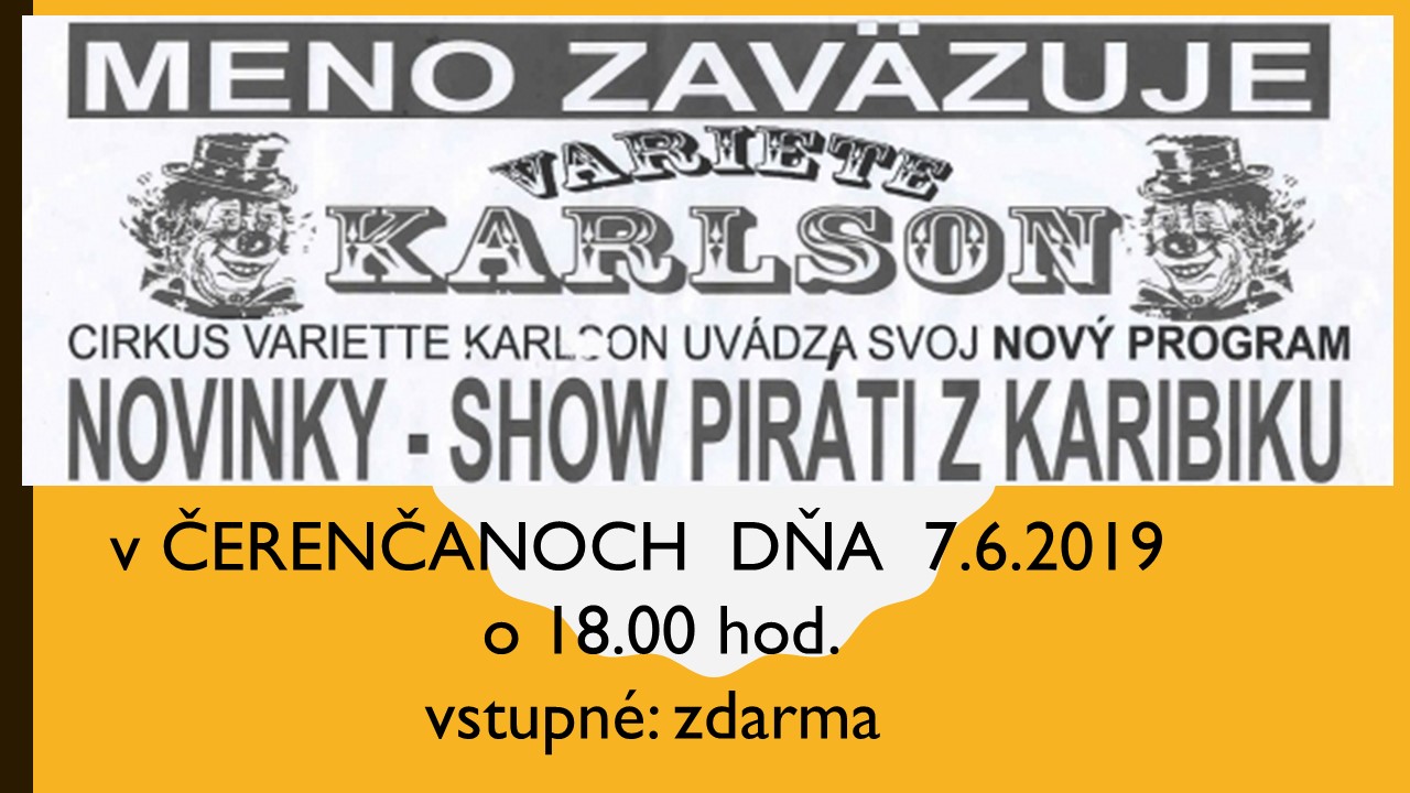 Pri príležitosti Medzinárodného dňa detí obec Čerenčany na deň 7.6.2019 pripravila v Kultúrnom dome Čerenčany o 18.00 hod. kultúrne popoludie s Cirkusom Variette Karlson, kde ste všetci vítaní. Tešíme sa na Vašu účasť.