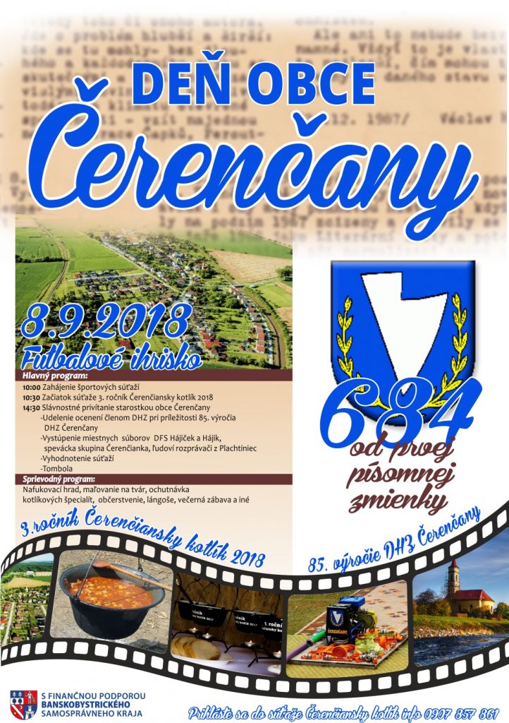 Vážení občania, pozývame Vás dňa 8.9.2018 na Deň obce Čerenčany, ktorý sa uskutoční na futbalovom ihrisku v Čerenčanoch.