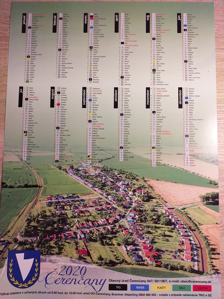 Informačný kalendár obce Čerenčany na rok 2020, si na začiatku nového týždňa nájdete vo Vašich schránkach. Informačný kalendár Vám môže pomôcť lepšie sa orientovať vo vývoze TKO a SZ v našej obci. Pôvodný rozpis, na ktorý ste zvyknutý je k dispozícii na OÚ alebo stránke obce.
