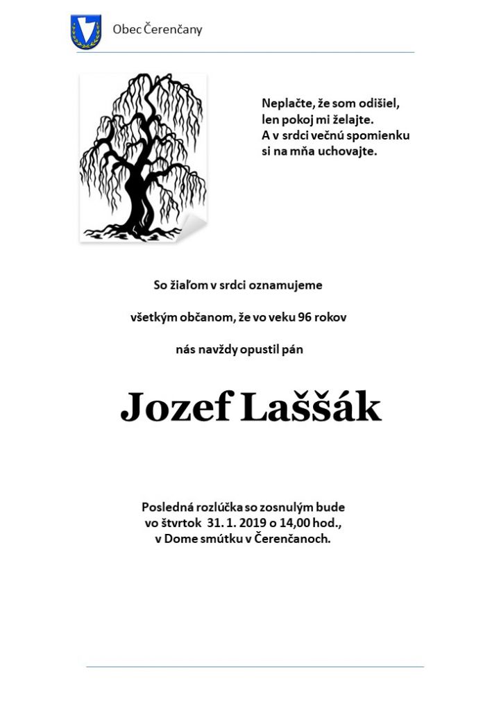 Posledná rozlúčka so zosnulým p. Jozefom Laššákom bude dňa 31.1.2019 (vo štvrtok) o 14,00 hod. v Dome smútku v Čerenčanoch.