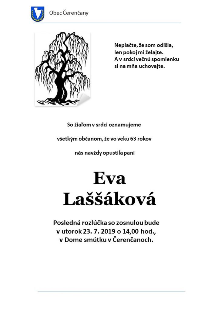Posledná rozlúčka so zosnulou Evou Laššákovou bude v utorok 23.7.2019 o 14:00 hod. v Dome smútku v Čerenčanoch.