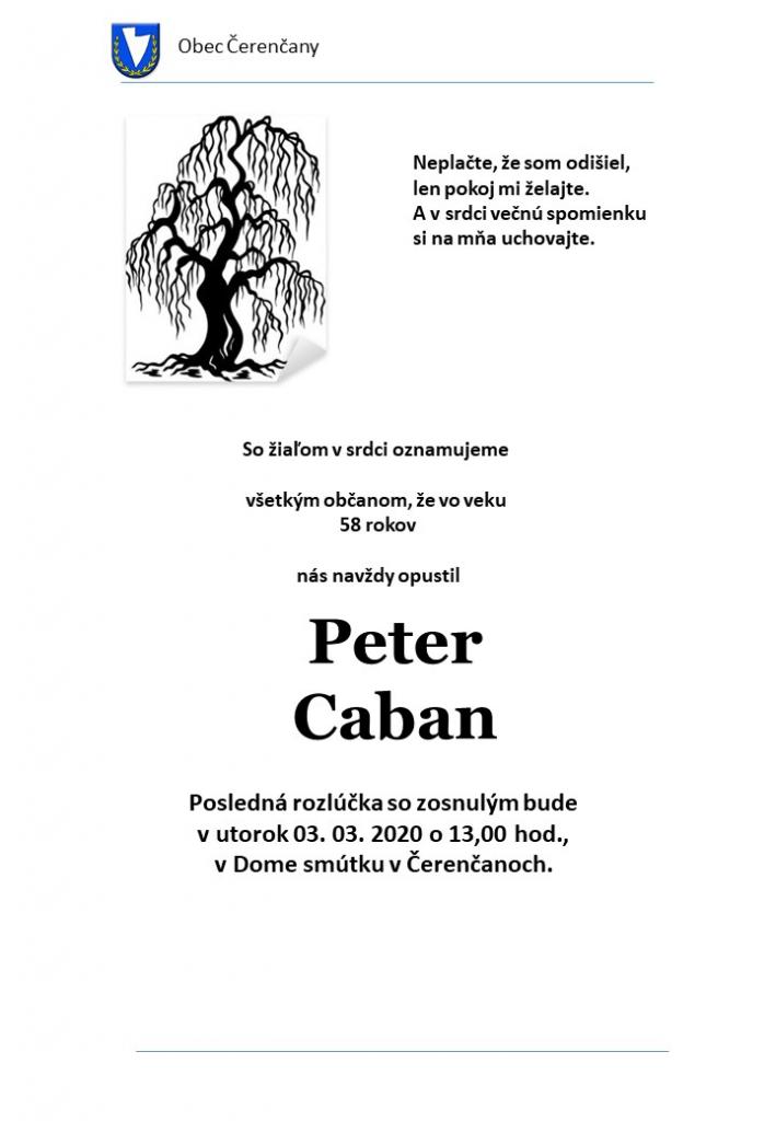 Posledná rozlúčka so zosnulým Petrom Cabanom bude v utorok 3.3.2020 o 13.00 hodine v Dome smútku v Čerenčanoch.