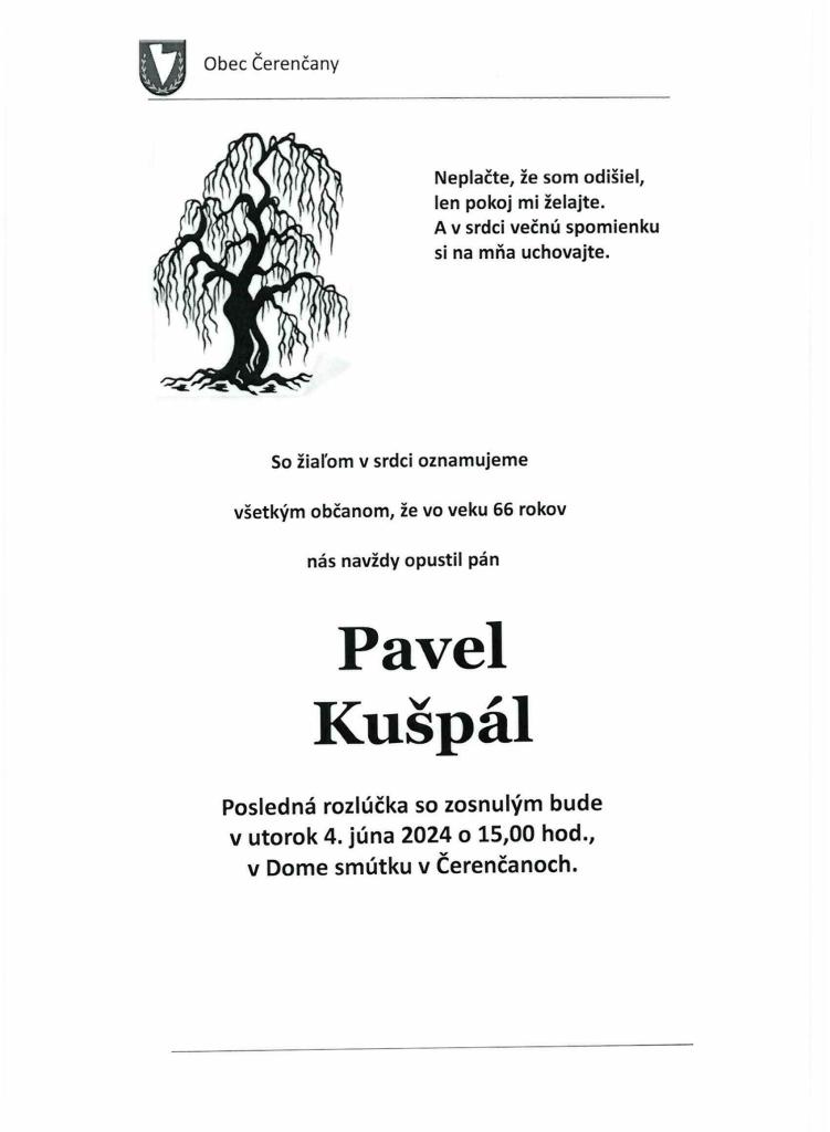 So žiaľom v srdci oznamujeme všetkým občanom, že vo veku 66 rokov nás navždy opustil p. Pavel Kušpál. Posledná rozlúčka so zosnulým bude v utorok 4. júna 2024 o 15,00 hodine v Dome smútku v Čerenčanoch.
