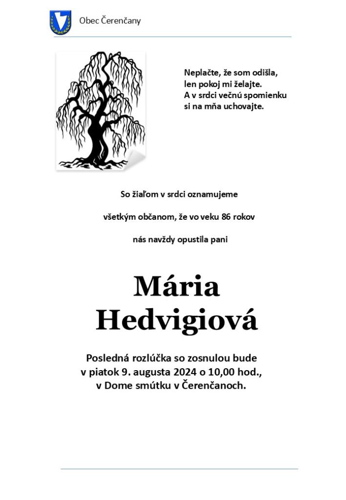 So žiaľom v srdci oznamujeme všetkým občanom, že vo veku 86 rokov nás navždy opustila pani Mária Hedvigiová. Posledná rozlúčka so zosnulou bude v piatok 9. augusta 2024 o 10,00 hodine v Dome smútku v Čerenčanoch.