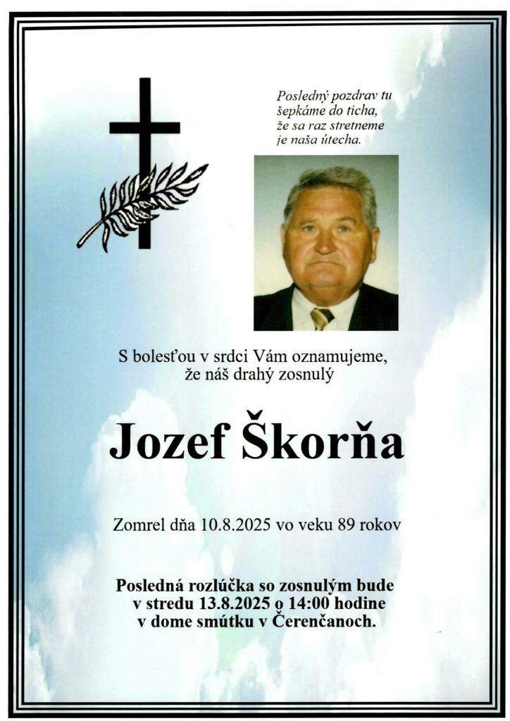 So žiaľom v srdci oznamujeme všetkým občanom, že vo veku 89 rokov nás navždy opustil pán Jozef Škorňa. Posledná rozlúčka so zosnulým bude v stredu 13. augusta 2025 o 14,00 hodine v Dome smútku v Čerenčanoch.