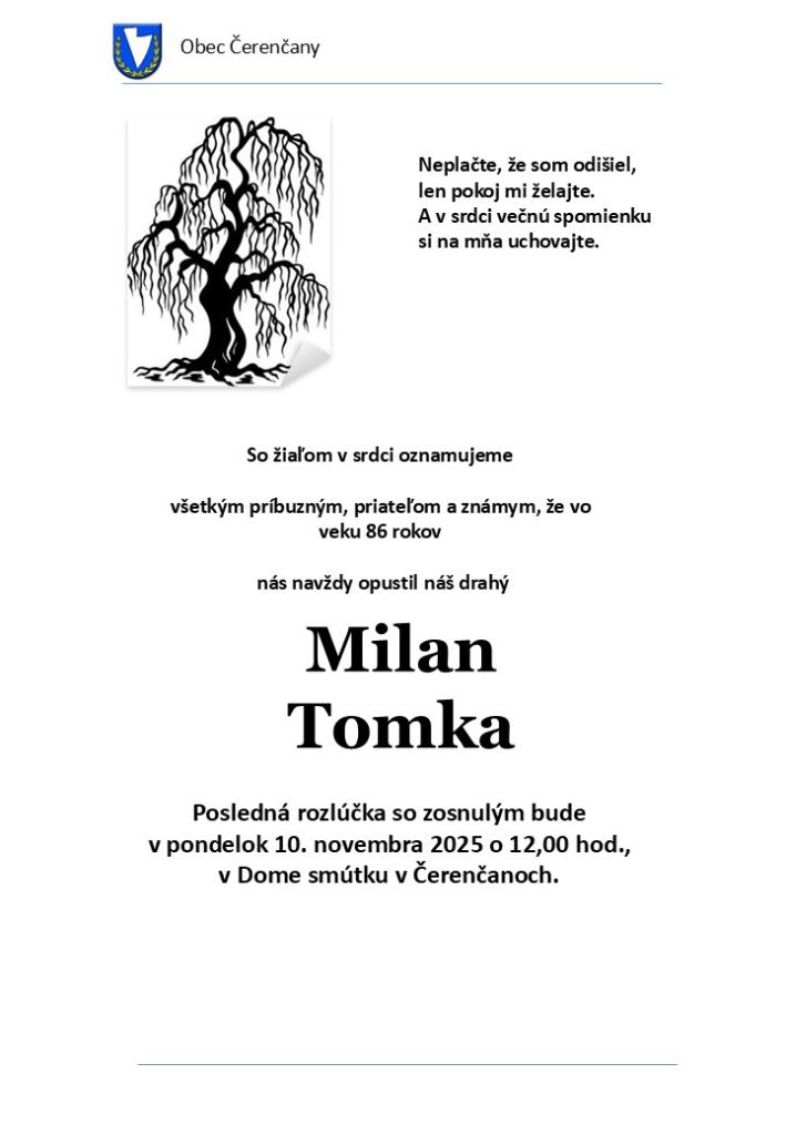 So žiaľom v srdci oznamujeme všetkým občanom, že vo veku 86 rokov nás navždy opustil pán Milan Tomka. Posledná rozlúčka so zosnulým bude v pondelok 10.novembra 2025 o 12,00 hodine v Dome smútku v Čerenčanoch.