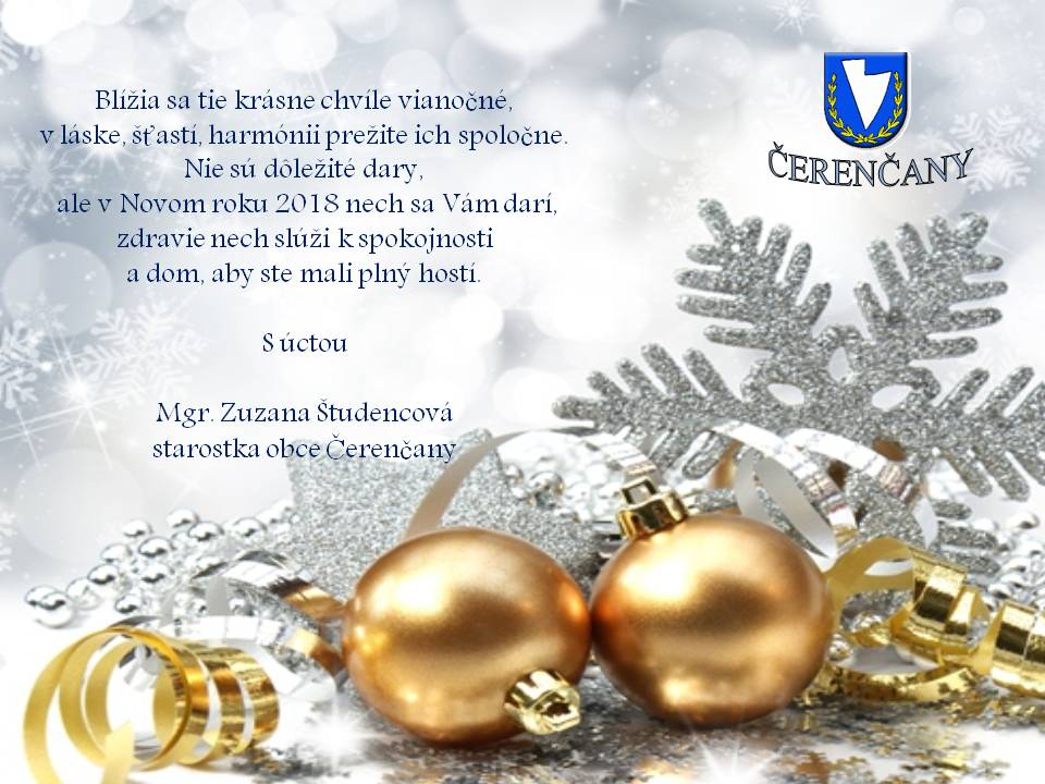 Blížia sa tie krásne chvíle vianočné, v láske, šťastí, harmónii prežite ich spoločne. Nie sú dôležité dary, ale v Novom roku 2018 nech sa Vám darí, zdravie nech slúži k spokojnosti a dom, aby ste mali plný hostí. S úctou