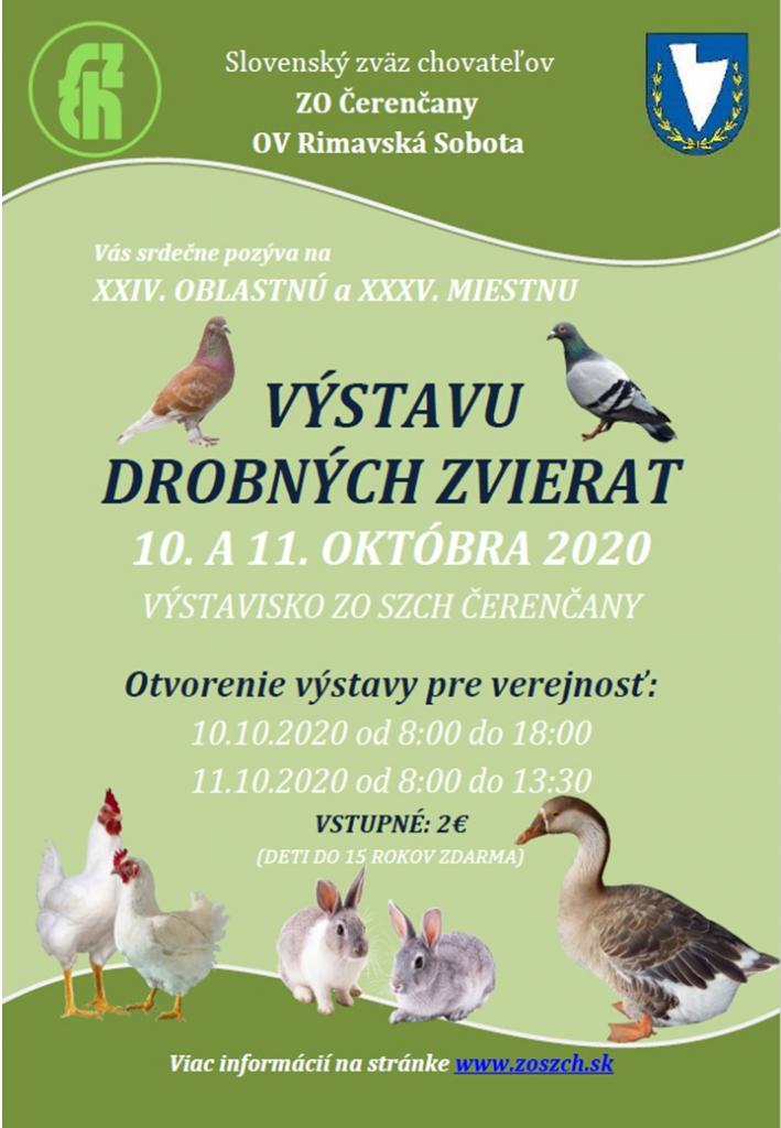 Vážení obyvatelia, ZO SZCH Čerenčany a OV Rimavská Sobota Vás srdečne pozývajú na XXIV. oblastnú a XXXV. miestnu výstavu drobných zvierat. Výstava sa bude konať na mieste výstaviska ZO SZCH Čerenčany v dňoch 10. a 11. októbra 2020.