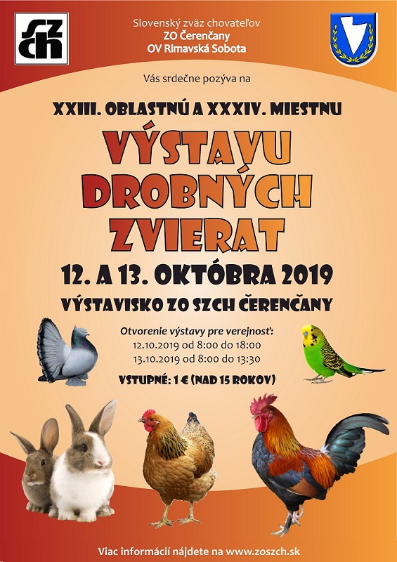 Základná organizácia Slovenského zväzu chovateľov v Čerenčanoch Vás srdečne pozýva na XXIII. Oblastnú a XXXIV. Miestnu výstavu drobných zvierat.