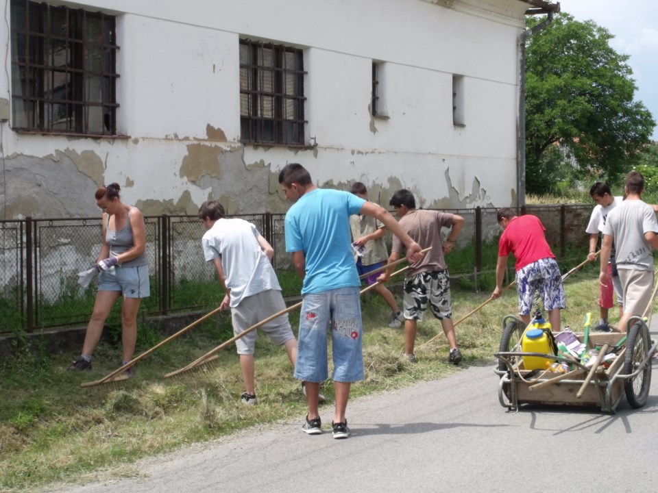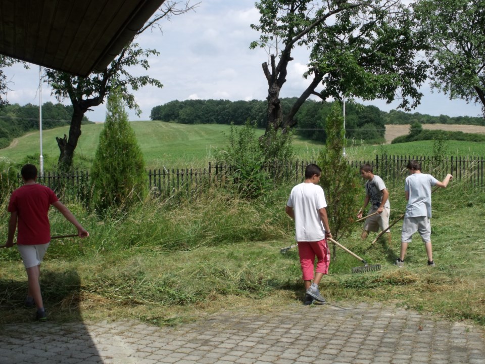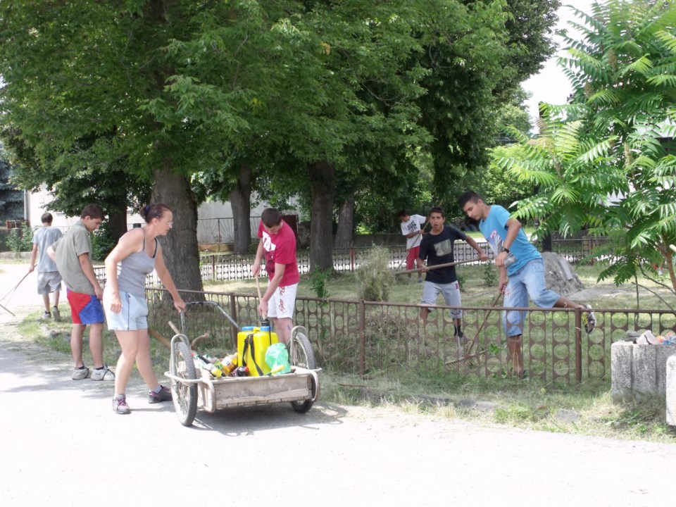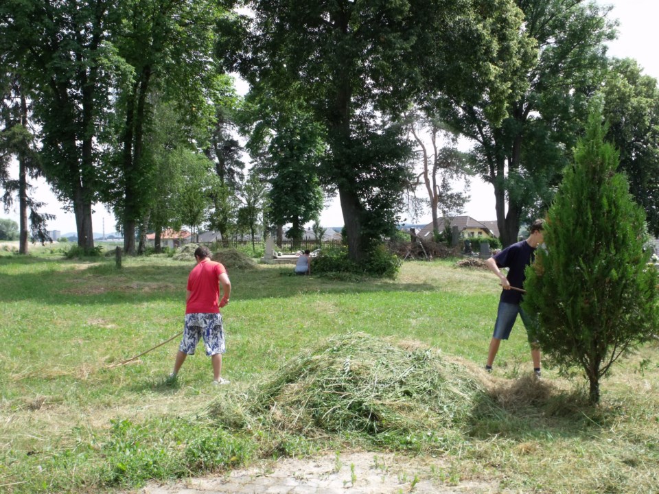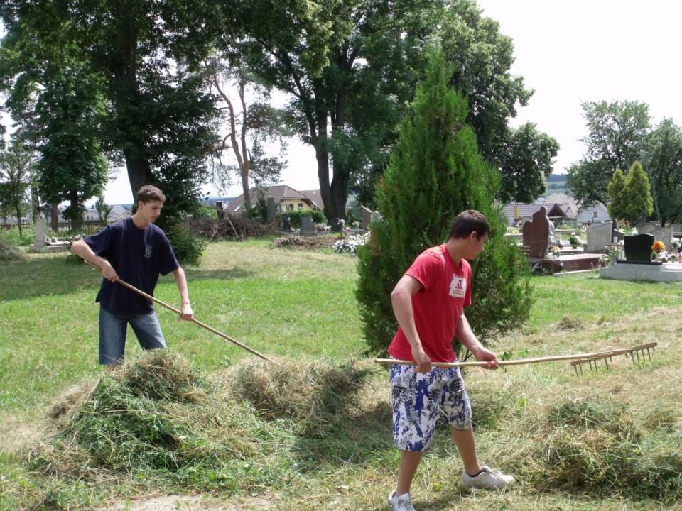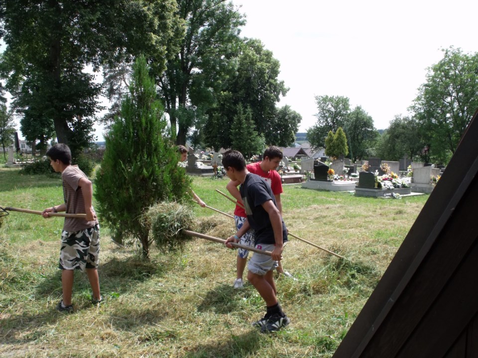Brigáda s pomocou detí z Reedukačného centra Čerenčany – údržba zelene v obci a cintoríne – 17.6.2014.